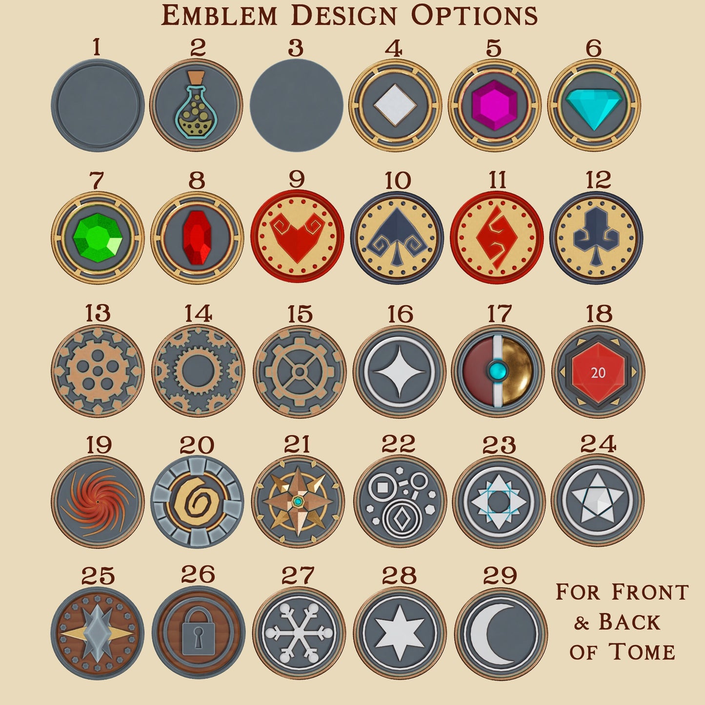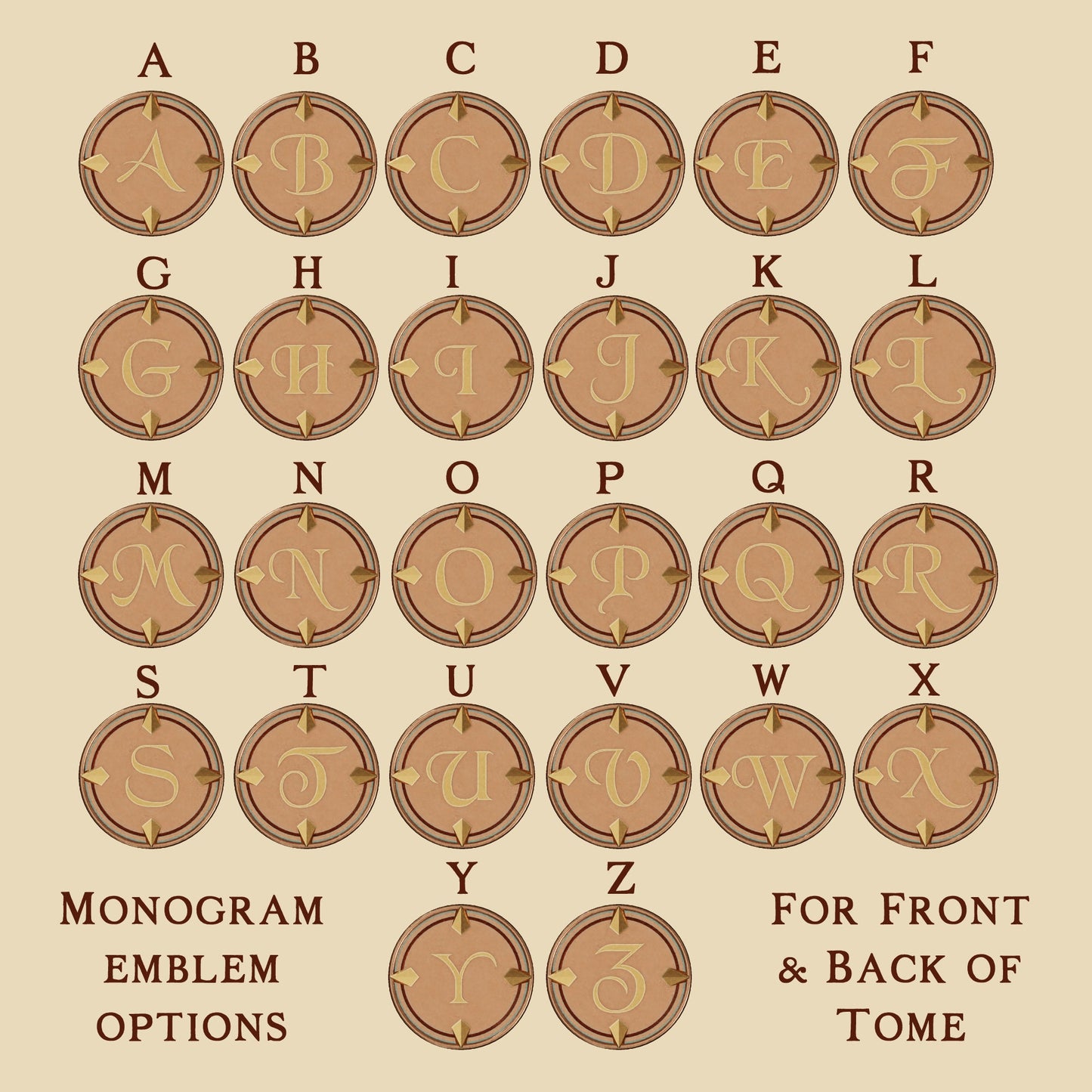 This tome also calls for two round emblems and one side (oval) emblem. Please tell us your choices in the personalization. Please note that the colors shown in the rendered images for the emblems will not be present in the final printed emblem. The emblems are printed in a single color.